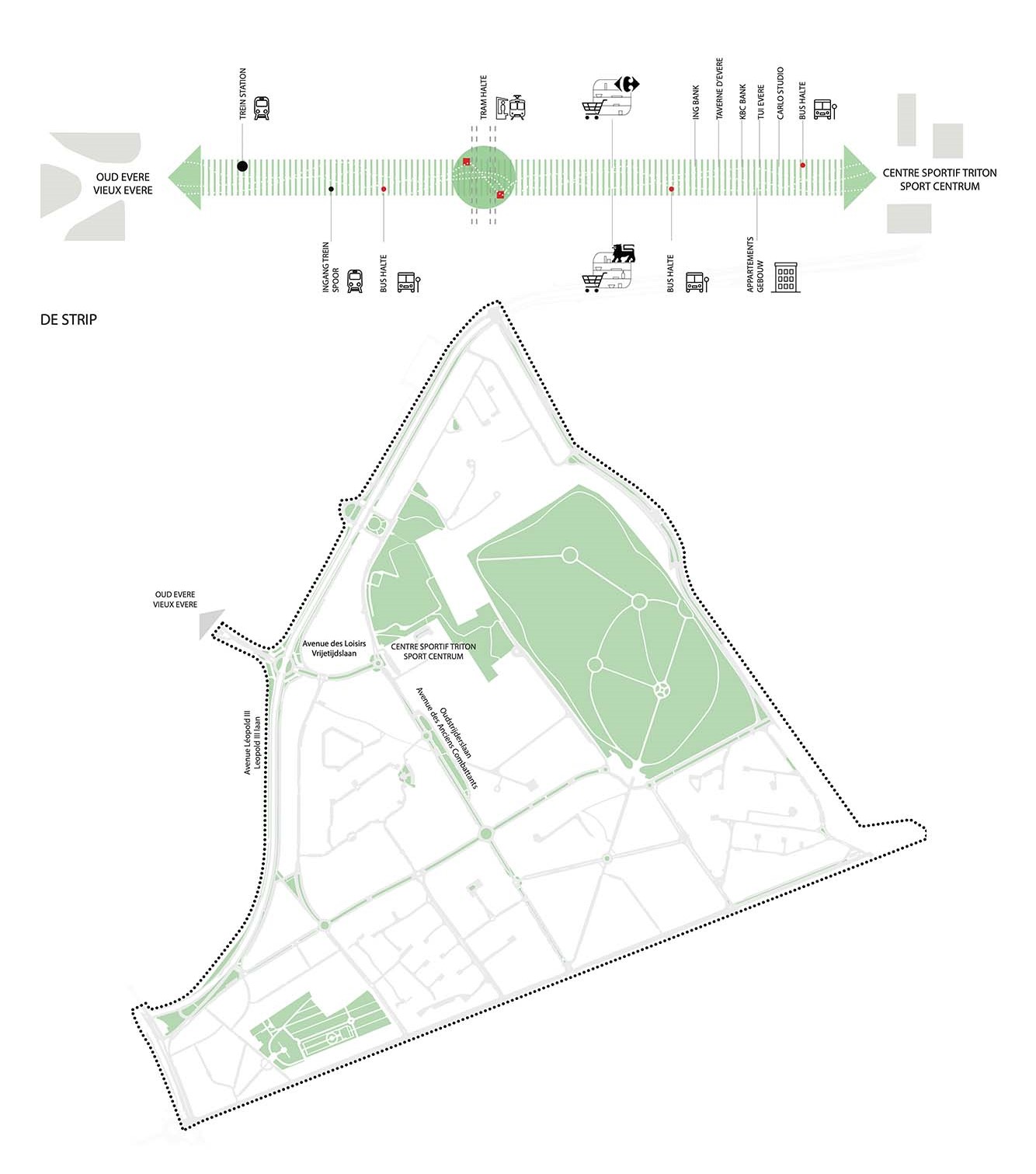 AVENUE DES LOISIRS / RUE AUGUSTE DE BOECK -Cet axe relie le vieux centre du village d’Evere au nouvel Evere moderne par un pont au-dessus du chemin de fer. Une installation sportive supra locale est implantée du côté de la nouvelle commune tandis que la gare d’Evere se situe de l’autre côté. Contrairement au tissu urbain médiéval du Pentagone, il y a beaucoup de place à Evere pour réaliser des installations sportives. Cette infrastructure sportive n’est pas seulement utile à la population locale, mais peut également constituer un lien important avec le reste de la ville. Dans le cadre de la lecture de la ville de Paris en 15’ minutes, l’accessibilité d’une telle fonction a été évoquée. La proposition consiste donc en un corridor vert sur lequel ces fonctions sont branchées.